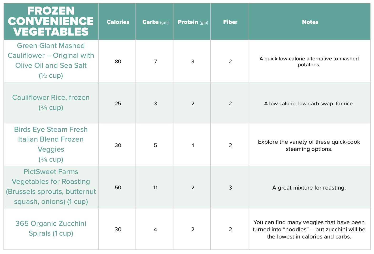 There are so many great frozen veggie options available and they can save you a lot of time. Check the label to make sure the one you choose does not have extra “sauce” or “seasonings” which can add additional calories and sodium.