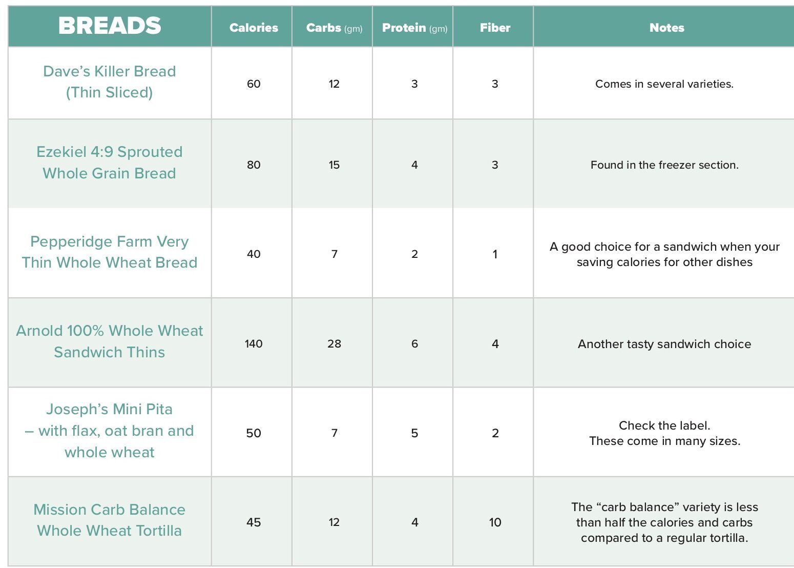 When choosing bread, look for choices that include whole wheat as a first ingredient and have a lot of dietary fiber. While you don’t have to choose a “thin-sliced” or a low-carb bread, those options do tend to save you calories and carbs which you can “spend” on other parts of your meal. Nutrition facts for all choices are for one slice of bread / one tortilla.